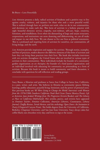 Love Activism presents a daily, radical activism of kindness and a positive way to live against cruelty, violence, and injustice. This is realized through how we perform our work, what we do in our communities, and decisions we make each day. This form of activism is a holistic practice with eight beautiful elements: service, empathy, non-violence, self-care, hope, creativity, feminism, and mindfulness. Even when the dismantling of large and unjust structures, corporations, and institutions can seem daunting and disheartening, we can all make real impact in our daily lives. We can choose to live our lives as political statements. This is a profound and inspiring form of activism for ourselves, our communities, all living beings, and the earth. Love Activism is a book for those who seek a more kind and peaceful world. It provides inspiration and support for activists. Through stories, examples, and lists of practices, readers discover the different elements of Love Activism and how they can bring these practices into their lives. The book also includes interviews with ten activists throughout the United States who are involved in various types of activism in their communities. These individuals include the founder of a community garden organization; an art therapist; the founder of a food justice organization; and an individual involved with educating his community on printmaking as a form of activism. Because this book is meant to build community and foster discussion, it concludes with questions for self-reflection and reading groups. Now is the time to be brave and love powerfully. Stacy Russo, a librarian and professor at Santa Ana College in Santa Ana, California, is a poet, writer, and artist. She believes in libraries as community spaces; lifelong learning; public education; peaceful living; feminism; and the power of personal story. Stacy is the editor of Life as Activism: June Jordan’s Writings from The Progressive (Litwin Books, 2014) and the author of We Were Going to Change the World: Interviews with Women from the 1970s and 1980s Southern California Punk Rock Scene (Santa Monica Press, 2017) and The Library as Place in California (McFarland, 2007). Her articles, poetry, and reviews have appeared in Feminist Teacher, Feminist Collections, American Libraries, Library Journal, Counterpoise, Chaffey Review, and Serials Review. She holds degrees from the University of California, Berkeley; Chapman University; and San Jose State University. Stacy always takes her coffee black; eats chocolate every day; and loves to nap at the ocean.