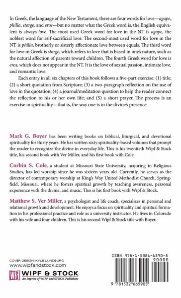 In Greek, the language of the New Testament, there are four words for love--agape, philia, storge, and eros--but no matter what the Greek word is, the English equivalent is always love. The most used Greek word for love in the NT is agape, the noblest word for self-sacrificial love. The second-most used word for love in the NT is philia, brotherly or sisterly affectionate love between equals. The third word for love in Greek is storge, which refers to love that is based in one's nature, such as the natural affection of parents toward children. The fourth Greek word for love is eros, which does not appear in the NT. It is the love of sexual passion, intimate love, and romantic love. Each entry in all six chapters of this book follows a five-part exercise: (1) title; (2) a short quotation from Scripture; (3) a two-paragraph reflection on the use of love in the quotation; (4) a journal/meditation question to help the reader connect the reflection to his or her own life; and (5) a short prayer. The process is an exercise in spirituality--that is, the way one is in the divine's presence.