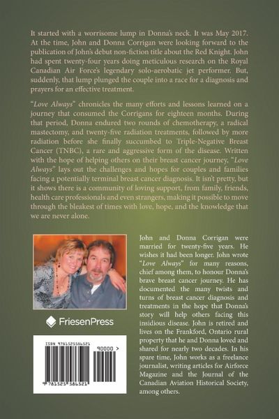 It started with a worrisome lump in Donna's neck. It was May 2017. At the time, John and Donna Corrigan were looking forward to the publication of John's debut non-fiction title about the Red Knight. John had spent twenty-four years doing meticulous research on the Royal Canadian Air Force's legendary solo-aerobatic jet performer. But, suddenly, that lump plunged the couple into a race for a diagnosis and prayers for an effective treatment. "Love Always" chronicles the many efforts and lessons learned on a journey that consumed the Corrigans for eighteen months. During that period, Donna endured two rounds of chemotherapy, a radical mastectomy, and twenty-five radiation treatments, followed by more radiation before she finally succumbed to Triple-Negative Breast Cancer (TNBC), a rare and aggressive form of the disease. Written with the hope of helping others on their breast cancer journey, "Love Always" lays out the challenges and hopes for couples and families facing a potentially terminal breast cancer diagnosis. It isn't pretty, but it shows there is a community of loving support, from family, friends, health care professionals and even strangers, making it possible to move through the bleakest of times with love, hope, and the knowledge that we are never alone. http://www.facebook.com/booksbyjohncharlescorrigan