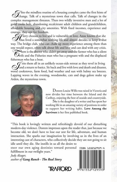Doreen-Louise Willis was raised in Victoria and now divides her time between the Island and the Cariboo, enjoying the best of seaside and countryside. She is the daughter of a writer and has spent her working life in an amazing variety of positions in order to support her writing habit. Love Among the Survivors is her first published book. ""This book is lovingly written and refreshingly devoid of our disturbing modern-day violence. Doreen impresses upon the reader that, just because we become old, we don't have to lose our zest for life, adventure, and human interaction. She sparks our imagination by involving us in the lives of an interesting cast of characters, who collectively decide they are not going to sit idle until they die. She instills in us all the desire to steer our own aging destinies toward personal fulfillment in our twilight years."" Judy Alsager, author of Gang Ranch - The Real Story