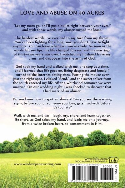 "Let my mom go, or I'll put a bullet right between your eyes," and with those words, my abuser turned me loose. The hardest words I've ever had to say tore from my throat. You've been fighting for a long time, you don't have to fight anymore. You can leave whenever you want to. As soon as the words left my lips, my life changed forever, and my marriage of thirty-two years was over. I watched my husband leave my arms, and disappear into the arms of God. Do you know how to spot an abuser? Can you see the warning signs, before you, or someone you love, gets involved? Before it's too late? Walk with me, and we'll laugh, cry, share, and learn together. Be there, as God takes my hand, and leads me on a journey, from a twice broken heart, to contentment in Him.