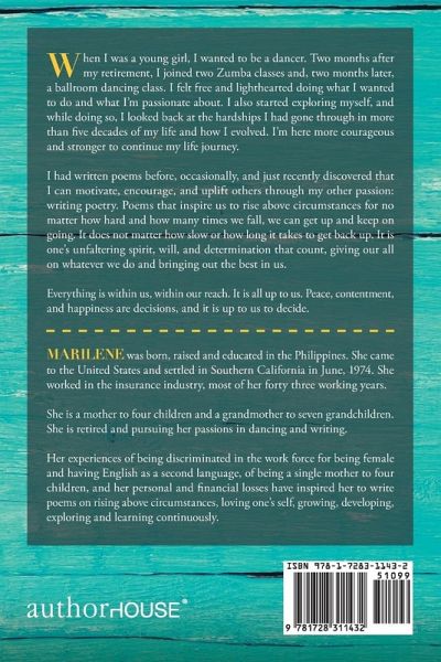 When I was a young girl, I wanted to be a dancer. Two months after my retirement, I joined two Zumba classes and, two months later, a ballroom dancing class. I felt free and lighthearted doing what I wanted to do and what I'm passionate about. I also started exploring myself, and while doing so, I looked back at the hardships I had gone through in more than five decades of my life and how I evolved. I'm here more courageous and stronger to continue my life journey. I had written poems before, occasionally, and just recently discovered that I can motivate, encourage, and uplift others through my other passion: writing poetry. Poems that inspire us to rise above circumstances for no matter how hard and how many times we fall, we can get up and keep on going. It does not matter how slow or how long it takes to get back up. It is one's unfaltering spirit, will, and determination that count, giving our all on whatever we do and bringing out the best in us. Everything is within us, within our reach. It is all up to us. Peace, contentment, and happiness are decisions, and it is up to us to decide.