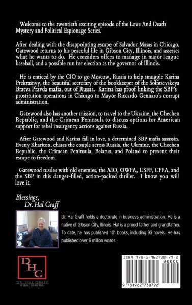 Love And Death in Moscow A Love and Death Mystery & Political Espionage Novel Volume 20 Welcome to the twentieth exciting episode of the After dealing with the disappointing escape of Salvador Masas in Chicago, Gatewood returns to his peaceful life in Gibson City, Illinois, and assesses what he wants to do. He considers offers to manage in major league baseball, and a possible run for election as the governor of Illinois. He is enticed by the CIO to go to Moscow, Russia to help smuggle Karina Prekrasnyy, the beautiful secretary of the bookkeeper of the Solntsevskeya Bratva Pravda mafia, out of Russia. Karina has proof linking the SBP's prostitution operations in Chicago to Mayor Riccardo Gennaro's corrupt administration. Gatewood also has another mission, to travel to the Ukraine, the Chechen Republic, and the Crimean Peninsula to discuss options for American support for rebel insurgency actions against Russia. After Gatewood and Karina fall in love, a determined SBP mafia assassin, Eveny Khariton, chases the couple across Russia, the Ukraine, the Chechen Republic, the Crimean Peninsula, Belarus, and Poland to prevent their escape to freedom. Gatewood tussles with old enemies, the AIO, OWFA, USFF, CFFA, and the SBP in this danger-filled, action-packed thriller. I know you will love it. Blessings, Dr. Hal Graff