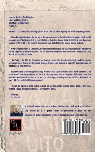 Love And Death In The Philippines A Love And Death Mystery & Political Espionage Novel Volume 25 Welcome to the twenty-fifth exciting episode of the Love And Death Mystery and Political Espionage Series. After closing the books on the last leg of dangerous mission in the British Isles, Gatewood flies from CIO headquarters in Washington, D.C. to comfort his long-time love Susana Richards, the third most dangerous assassin in the world, at the hospital. Her survival, and that of their two unborn babies, is at risk. After time at his home in Gibson City, he is called back to duty by the CIO because the world has become a more dangerous place in his absence. The British Isles has exploded with new violence by the IOFFI, SPFIF, WISAM, and the USFF in London. The Yakuza, the SBP, the Columbian and Mexican cartels, the Durante crime family and the Gennaro administration in Chicago are furnishing weapons, training, and fighters to make the violent demands for independence remain strong. Gatewood heads to the Philippines to help President Datu Laarni overcome a civil war with the CFFA, led by Gatewood's lover Ligaya Diwata, and the USFF. Shocking events lead to a desperate decision by Laarni that leads Gatewood to the front lines of the war, and into danger. Crushing surprises unfold for Gatewood, his lovers, his foes, and the Philippine president. Please join Gatewood as he battles enemies, old and new, in this exciting, danger-packed, love-filled, surprise-loaded, explosive adventure. I know you will love it. Blessings, Dr. Hal Graff