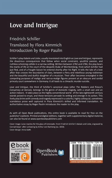 Schiller's play Kabale und Liebe, usually translated into English as Love and Intrigue, represents the disastrous consequences that follow when social constraint, youthful passion, and ruthless scheming collide in a narrow setting. Written between 1782 and 1784, the play bears the marks of life at the court of the despotic Duke of Württemberg, from which Schiller had just fled, and of a fraught liaison he entered shortly after his flight. It tells the tale of a love affair that crosses the boundaries of class, between a fiery and rebellious young nobleman and the beautiful and dutiful daughter of a musician. Their affair becomes entangled in the competing purposes of malign and not-so-malign figures present at an obscure and sordid princely court somewhere in Germany. It all leads to a climactic murder-suicide. Love and Intrigue, the third of Schiller's canonical plays (after The Robbers and Fiesco's Conspiracy at Genoa), belongs to the genre of domestic tragedy, with a small cast and an action indoors. It takes place as the highly conventional world of the late eighteenth century stands poised to erupt, and these tensions pervade its setting and emerge in its action. This lively play brims with comedy and tragedy expressed in a colorful, highly colloquial, sometimes scandalous prose well captured in Flora Kimmich's skilled and informed translation. An authoritative essay by Roger Paulin introduces the reader to the play. As with all books in the Open Book Classics series, this translation is supported by an introduction and notes that situate an old text in its period and help both the student and the general reader read it with ease and with pleasure.