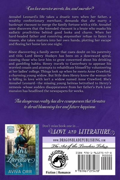 Can love survive secrets, lies, and murder? Annabel Leonard's life takes a drastic turn when her father, a wealthy confectionary merchant, demands that she marry a bankrupt viscount to merge the family fortune with a title. Annabel soon discovers that the intended viscount is a brute who masks his sadistic proclivities behind good looks and charm. When her hard-headed father and conniving stepmother refuse to listen to reason, she takes matters into her own hands, plotting her escape and fleeing her home late one night. Since discovering a family secret that casts doubt on his paternity and title, Lord Henry Hudsyn has been on a downward spiral, causing those who love him to grow concerned about his drinking and gambling habits. Henry travels to Canterbury to appease his worried cousin and attempts to rehabilitate himself by volunteering at her ladies' college. Things look up when he meets Anne Crawford, a charming young widow. But little does Henry know the woman he is falling in love with isn't a widow named Anne Crawford. She's Annabel Leonard-the missing young heiress betrothed to Henry's nemesis-whose sudden disappearance from her father's Park Lane mansion has headlined the newspapers for weeks. This dangerous reality has dire consequences that threaten to derail blossoming love and future happiness.