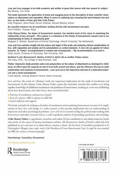 "Parkes' impressive study provides some new perspectives on the nature of attachment as developed in childhood, its effect upon the capacity (or not) to trust both oneself and others, and the influence this has on adult relationships and responses to bereavement...Love and Loss is the impressive outcome of a dedicated empiricist and a warm humanitarian." - Linda Machin, Visiting Research Fellow, Keele University, UK