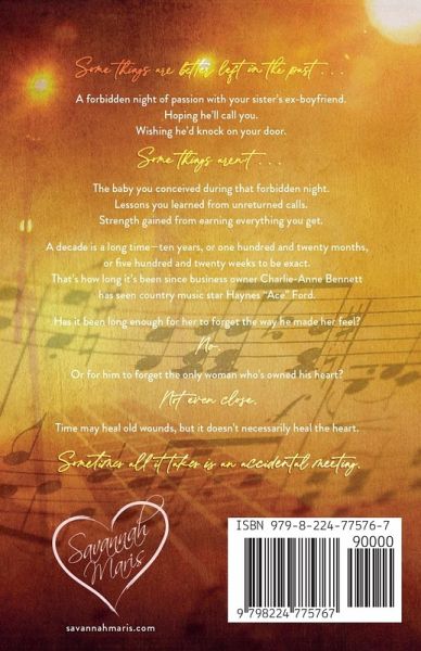 Some things are better left in the past . . . A forbidden night of passion with your sister's ex-boyfriend. Hoping he'll call you. Wishing he'd knock on your door. Some things aren't . . . The baby you conceived during that forbidden night. Lessons you learned from unreturned calls. Strength gained from earning everything you get. A decade is a long time-ten years, or one hundred and twenty months, or five hundred and twenty weeks to be exact. That's how long it's been since business owner Charlie-Anne Bennett has seen country music star Haynes "Ace" Ford. Has it been long enough for her to forget the way he made her feel? No. Or for him to forget the only woman who's owned his heart? Not even close. Time may heal old wounds, but it doesn't necessarily heal the heart. Sometimes all it takes is an accidental meeting.