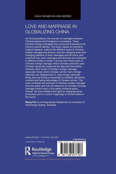 As China globalises the number of marriages between Chinese people and foreigners is increasing. These Chinese-foreign marriages have profound implications for China's cultural identity. This book, based on extensive original research, outlines the different types of Chinese-foreign marriage, and divorce, and the changing scale and changing patterns of such marriages, and divorces, and examines how such marriages and divorces are portrayed in different kinds of media. Overall, the book sheds much light on changing social processes and on current imaginings of China's place in the world.