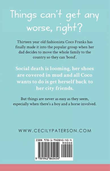 Thirteen year old fashionista Coco Franks has finally made it into the popular group when her dad decides to move the whole family to the country so they can 'bond'. Social death is looming, her shoes are covered in mud and all Coco wants to do is get herself back to her city friends. After all, things can't get any worse, right? It'll take a boy with no dress sense and totally hick boots, and a contrary horse called Cupcake to bring Coco to her senses. But it might just be too little, too late. Love and Muddy Puddles is humorous realistic fiction aimed at children aged 10-14 and horse lovers everywhere. Set in Australia, this clean teen romance is a funny and inspiring story of how a horse - and a change of perspective and heart - can change a young person's life. Love and Muddy Puddles is the third novel by Australian writer Cecily Anne Paterson. Her first novel, Invisible, also a clean, realistic story for girls and teenagers, was called an 'exquisitely written story' by Publisher's Weekly reviewer of teenage fiction, and was a semifinalist in the Amazon Breakthrough Novel Awards in 2014.