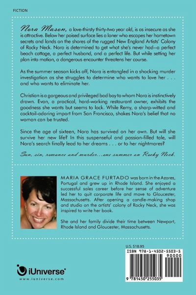 Nora Mason, a love-thirsty thirty-two year old, is as insecure as she is attractive. Below her poised surface lies a loner who escapes her hometown secrets and lands on the shores of the rugged New England Artists' Colony of Rocky Neck. Nora is determined to get what she's never had--a perfect beach cottage, a perfect husband, and a perfect life. But while setting her plan into motion, a dangerous encounter threatens her course. As the summer season kicks off, Nora is entangled in a shocking murder investigation as she struggles to determine who wants to love her . . . and who wants to eliminate her. Christian is a gorgeous and privileged bad boy to whom Nora is instinctively drawn. Evan, a practical, hard-working restaurant owner, exhibits the goodness she wants but seems to lack. While Remy, a sharp-witted and cocktail-adoring import from San Francisco, shakes Nora's belief that no woman can be trusted. Since the age of sixteen, Nora has survived on her own. But will she survive her new life? In this suspenseful and passion-filled tale, will Nora's search finally lead to her dreams . . . or to her nightmares? Sun, sin, romance and murder . . . one summer on Rocky Neck.