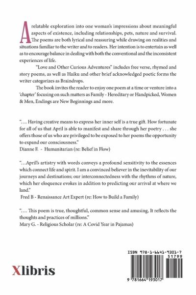 A relatable exploration into one woman's impressions about meaningful aspects of existence, including relationships, pets, nature and survival. The poems are both lyrical and reassuring while drawing on realities and situations familiar to the writer. Her intention is to entertain as well as to encourage balance in dealing with both the conventional and the inconsistent experiences of life. "Love and Other Curious Adventures" includes free verse, rhymed and story poems, as well as Haiku and other brief acknowledged poetic forms the writer categorizes as Braindrops. The book invites the reader to enjoy one poem at a time or venture into a 'chapter' focusing on such matters as Family - Hereditary or Handpicked, Women & Men, Endings are New Beginnings and more. ".... Having creative means to express her inner self is a true gift. How fortunate for all of us that April is able to manifest and share through her poetry . . . she offers those of us who are privileged to be exposed to her poems the opportunity to expand our consciousness." Dianne F. - Humanitarian (re: Belief in Flow) "...April's artistry with words conveys a profound sensitivity to the essences which connect life and spirit. I am a convinced believer in the inevitability of our journeys and destinations; our interconnectedness with the rhythms of nature, which her eloquence evokes in addition to predicting our arrival at where we land." Fred B - Renaissance Art Expert (re: How to Build a Family) ".... This poem is true, thoughtful, common sense and amusing, It reflects the thoughts and practices of millions." Mary G. - Religious Scholar (re: A Covid Year in Pajamas)