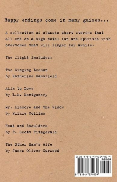 Happy endings come in many guises.... A "taster flight" collection of classic love stories that end on a high note: fun and spirited, with overtones that will linger awhile. The flight includes: The Singing Lesson, by Katherine Mansfield Akin to Love, by L.M. Montgomery Mr. Lismore and the Widow, by Wilkie Collins Head and Shoulders, by F. Scott Fitzgerald The Other Man's Wife, by James Oliver Curwood