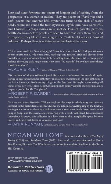 Love and other Mysteries are poems of longing and of seeking from the perspective of a woman in midlife. They are poems of Thank you and I wish, poems that embrace life's mysterious turns to the click of rosary beads, round and round the four Mysteries: Joyful, Luminous, Sorrowful, and Glorious. Perhaps stories must include loss--of parents, partners, health, dreams--before people are open to Love that loves them first, and in response, they blush. Love sung in the Canticle of Canticles, Song of Solomon. Perhaps there is nothing more theological than eros.