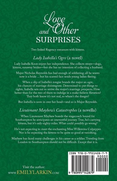 Two linked Regency romances published together for the very first time! This delightfully heartwarming duo from USA Today bestselling author Emily Larkin features one London beauty, one scarred major, one dashing lieutenant, one intrepid young lady ... and a litter of kittens. Length: A novel and a novella totaling 99,000 words Heat level: Two Regency romances containing mildly sensual love scenes If you love captivating historical romances brimming with humor, emotion, and animals, then this duo is for you! Lady Isabella's Ogre (a novel) Lady Isabella Knox enjoys her independence. She collects strays-dogs, kittens, runaway brides-but she has no intention of collecting a husband. Major Nicholas Reynolds has had enough of soldiering; all he wants now is a bride ... but his scarred face sends young ladies fleeing. When a slip of Isabella's tongue brands the major an ogre, his chances of marriage disintegrate. Determined to put things to rights, Isabella sets out to revive the major's marriage prospects. How better than for the two of them to indulge in a make-believe flirtation? They both know it's not real, so where's the danger? But Isabella is soon in over her head-and so is Major Reynolds. Lieutenant Mayhew's Catastrophes (a novella) When Lieutenant Mayhew boards the stagecoach bound for Southampton he anticipates an uneventful journey. True, he's carrying kittens, but it's only eighty miles. What could possibly go wrong? He's not expecting to meet the enchanting Miss Willemina Culpepper. Nor is he expecting the kittens to be quite so good at vanishing. Mayhew has faced many challenges in his career as a soldier. Traveling from London to Southampton should not be difficult. Except that it is.