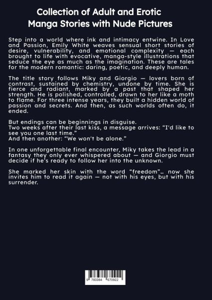 Step into a world where ink and intimacy entwine. In Love and Passion, Emily White weaves sensual short stories of desire, vulnerability, and emotional complexity - each brought to life with evocative, manga-style illustrations that seduce the eye as much as the imagination. These are tales for the modern romantic: daring, poetic, and deeply human.The title story follows Miky and Giorgio - lovers born of contrast, sustained by chemistry, undone by time. She is fierce and radiant, marked by a past that shaped her strength. He is polished, controlled, drawn to her like a moth to flame. For three intense years, they built a hidden world of passion and secrets. And then, as such worlds often do, it ended.But endings can be beginnings in disguise.Two weeks after their last kiss, a message arrives: "I'd like to see you one last time."And then another: "We won't be alone."In one unforgettable final encounter, Miky takes the lead in a fantasy they only ever whispered about - and Giorgio must decide if he's ready to follow her into the unknown.She marked her skin with the word "freedom"... now she invites him to read it again - not with his eyes, but with his surrender.