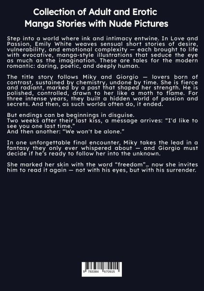 Step into a world where ink and intimacy entwine. In Love and Passion, Emily White weaves sensual short stories of desire, vulnerability, and emotional complexity - each brought to life with evocative, manga-style illustrations that seduce the eye as much as the imagination. These are tales for the modern romantic: daring, poetic, and deeply human.The title story follows Miky and Giorgio - lovers born of contrast, sustained by chemistry, undone by time. She is fierce and radiant, marked by a past that shaped her strength. He is polished, controlled, drawn to her like a moth to flame. For three intense years, they built a hidden world of passion and secrets. And then, as such worlds often do, it ended.But endings can be beginnings in disguise.Two weeks after their last kiss, a message arrives: "I'd like to see you one last time."And then another: "We won't be alone."In one unforgettable final encounter, Miky takes the lead in a fantasy they only ever whispered about - and Giorgio must decide if he's ready to follow her into the unknown.She marked her skin with the word "freedom"... now she invites him to read it again - not with his eyes, but with his surrender.
