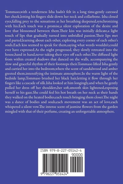 Tommaso, with a tenderness Isha hadn't felt in a long time, gently caressed her cheek, letting his fingers slide down her neck and collarbone. Isha closed eyes, falling prey to the sensations as her breathing deepened, synchronizing with his.Each touch was a promise, a silent exploration of the desire and love that blossomed between them.Their kiss was initially delicate, a light touch of lips that gradually turned into unbridled passion.Their lips met and parted, learning about each other, exploring every corner of each other's souls.Each kiss seemed to speak for them, saying what words wouldn't, could ever have expressed.As the night progressed, they slowly retreated into the house, hand in hand, never taking their eyes off each other.The diffused light from within created shadows that danced on the walls, accompanying the slow and graceful rhythm of their footsteps their.Tommaso lifted Isha gently and carried her into the bedroom, where the scent of sandalwood and amber greeted them, intensifying the intimate atmosphere.In the warm light of the bedside lamp, Tommaso brushed her black hair, letting it flow through her fingers like a cascade of silk.Isha looked at him longingly, and when he gently pulled her dress off her shoulders, her soft, smooth skin lightened, exposing herself to his gaze.She could feel his hot breath on her neck as their hands they walked on the heated bodies, each touch bringing them closer.The night was a dance of bodies and souls, each movement was an act of love, each whispered a silent vow.The intense scent of jasmine flowers from the garden mingled with that of their perfume, creating an unforgettable atmosphere.