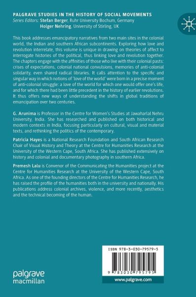 This book addresses emancipatory narratives from two main sites in the colonial world, the Indian and southern African subcontinents. Exploring how love and revolution interrelate, this volume is unique in drawing on theories of affect to interrogate histories of the political, thus linking love and revolution together. The chapters engage with the affinities of those who live with their colonial pasts: crises of expectations, colonial national convulsions, memories of anti-colonial solidarity, even shared radical libraries. It calls attention to the specific and singular way in which notions of 'love of the world' were born in a precise moment of anti-colonial struggle: a love of the world for which one would offer one's life, and for which there had been little precedent in the history of earlier revolutions. It thus offers new ways of understanding the shifts in global traditions of emancipation over two centuries.