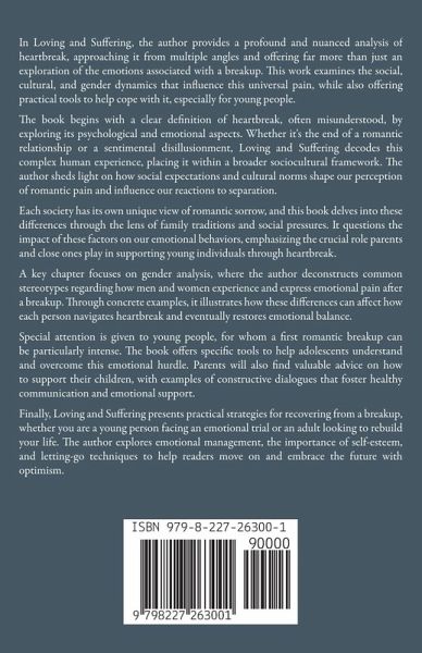 In Loving and Suffering, the author provides a profound and nuanced analysis of heartbreak, approaching it from multiple angles and offering far more than just an exploration of the emotions associated with a breakup. This work examines the social, cultural, and gender dynamics that influence this universal pain, while also offering practical tools to help cope with it, especially for young people. The book begins with a clear definition of heartbreak, often misunderstood, by exploring its psychological and emotional aspects. Whether it's the end of a romantic relationship or a sentimental disillusionment, Loving and Suffering decodes this complex human experience, placing it within a broader sociocultural framework. The author sheds light on how social expectations and cultural norms shape our perception of romantic pain and influence our reactions to separation. Each society has its own unique view of romantic sorrow, and this book delves into these differences through the lens of family traditions and social pressures. It questions the impact of these factors on our emotional behaviors, emphasizing the crucial role parents and close ones play in supporting young individuals through heartbreak. A key chapter focuses on gender analysis, where the author deconstructs common stereotypes regarding how men and women experience and express emotional pain after a breakup. Through concrete examples, it illustrates how these differences can affect how each person navigates heartbreak and eventually restores emotional balance. Special attention is given to young people, for whom a first romantic breakup can be particularly intense. The book offers specific tools to help adolescents understand and overcome this emotional hurdle. Parents will also find valuable advice on how to support their children, with examples of constructive dialogues that foster healthy communication and emotional support. Finally, Loving and Suffering presents practical strategies for recovering from a breakup, whether you are a young person facing an emotional trial or an adult looking to rebuild your life. The author explores emotional management, the importance of self-esteem, and letting-go techniques to help readers move on and embrace the future with optimism. This book reminds us that heartbreak, though painful, is a natural and universal emotion that must be accepted to be overcome. By demystifying this experience, Loving and Suffering encourages readers to see heartbreak not as an end, but as an opportunity for personal growth and resilience. Through inspiring testimonials and relatable examples, it invites readers to turn their pain into inner strength and move forward towards a better future.