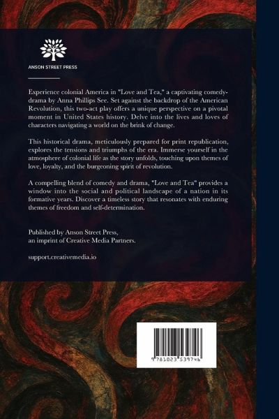 Experience colonial America in "Love and Tea," a captivating comedy-drama by Anna Phillips See. Set against the backdrop of the American Revolution, this two-act play offers a unique perspective on a pivotal moment in United States history. Delve into the lives and loves of characters navigating a world on the brink of change. This historical drama, meticulously prepared for print republication, explores the tensions and triumphs of the era. Immerse yourself in the atmosphere of colonial life as the story unfolds, touching upon themes of love, loyalty, and the burgeoning spirit of revolution. A compelling blend of comedy and drama, "Love and Tea" provides a window into the social and political landscape of a nation in its formative years. Discover a timeless story that resonates with enduring themes of freedom and self-determination. This work has been selected by scholars as being culturally important, and is part of the knowledge base of civilization as we know it. This work is in the public domain in the United States of America, and possibly other nations. Within the United States, you may freely copy and distribute this work, as no entity (individual or corporate) has a copyright on the body of the work. Scholars believe, and we concur, that this work is important enough to be preserved, reproduced, and made generally available to the public. We appreciate your support of the preservation process, and thank you for being an important part of keeping this knowledge alive and relevant.
