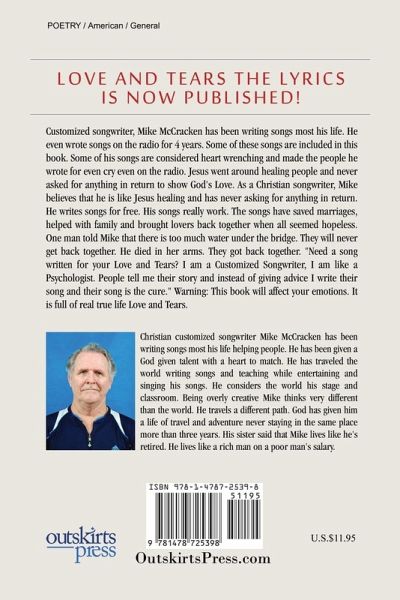 Customized songwriter, Mike McCracken has been writing songs most his life. He even wrote songs on the radio for 4 years. Some of these songs are included in this book. Some of his songs are considered heart wrenching and made the people he wrote for even cry even on the radio. Jesus went around healing people and never asked for anything in return to show God's Love. As a Christian songwriter, Mike believes that he is like Jesus healing and has never asking for anything in return. He writes songs for free. His songs really work. The songs have saved marriages, helped with family and brought lovers back together when all seemed hopeless. One man told Mike that there is too much water under the bridge. They will never get back together. He died in her arms. They got back together. "Need a song written for your Love and Tears? I am a Customized Songwriter, I am like a Psychologist. People tell me their story and instead of giving advice I write their song and their song is the cure." Warning: This book will affect your emotions. It is full of real true life Love and Tears. About the Author: Mike has traveled the world writing songs and teaching while entertaining and singing his songs. He considers the world his stage and his classroom. Being overly creative Mike thinks very different than the world. He travels a different path. He considers himself to be the only normal one. He claims to see things and know things which helps him write his songs because it gives him great understanding. Maybe, that is why his songs work. They truly are a gift from God especially to the people he writes for because you can feel the emotions. God has given him a life of travel and adventure never staying in the same place more than three years. His songs show his life experiences and others very well. His sister said that Mike lives like he's retired. He lives like a rich man on a poor man's salary. Someone once told him that he cannot travel the world without money. He did it at least