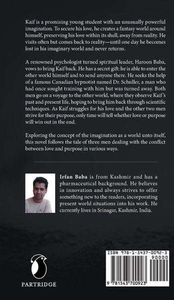 Kaif is a promising young student with an unusually powerful imagination. To secure his love, he creates a fantasy world around himself, preserving his love within its shell, away from reality. He visits often but comes back to reality-until one day he becomes lost in his imaginary world and never returns. A renowned psychologist turned spiritual leader, Haroon Baba, vows to bring Kaif back. He has a secret gift: he is able to enter the other world himself and to send anyone there. He seeks the help of a famous Canadian hypnotist named Dr. Schuller, a man who had once sought training with him but was turned away. Both men go on a voyage to the other world, where they observe Kaif's past and present life, hoping to bring him back through scientific techniques. As Kaif struggles for his love and the other two men strive for their purpose, only time will tell whether love or purpose will win out in the end. Exploring the concept of the imagination as a world unto itself, this novel follows the tale of three men dealing with the conflict between love and purpose in various ways.