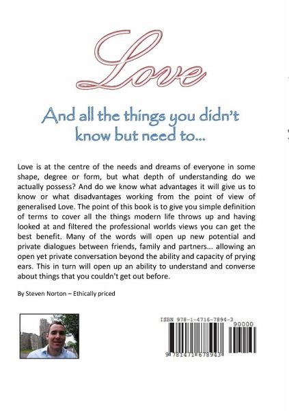 Love is at the center of the needs and dreams of everyone in some shape, degree or form, but what depth of understanding do we actually possess? Do we know what advantages it will give us to have clear definitions? Do we know what disadvantages working from generalized ambiguous assumptions can have on us and friends or family? The point of this book is to give you simple definition of terms to cover all the things modern life throws up. Including definitions which protect us and which pertain to the clinical understanding in love and it's negative side. Many of the words will open up new potential and private dialogues between friends, family and partners... allowing an open yet private conversation beyond the ability and capacity of prying ears. This in turn will open up an ability to understand and converse about things that you couldn't get out before or comprehend, and why you couldn't fix them.