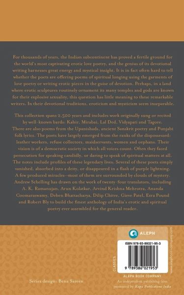 For thousands of years, the Indian subcontinent has proved a fertile ground for the world's most captivating erotic love poetry, and the genius of its devotional writing harnesses great energy and mystical insight. It is in fact often hard to tell whether the poets are offering poems of spiritual longing using the garments of love poetry or writing erotic pieces in the guise of devotion. Perhaps, in a land where erotic sculptures routinely ornament its many temples and gods are known for their explosive sexuality, this question has little meaning to these remarkable writers. In their devotional traditions, eroticism and mysticism seem inseparable. This collection spans 2,500 years and includes work originally sung or recited by well-known bards: Kabir, Mirabai, Lal Ded, Vidyapati and Tagore. There are also poems from the Upanishads, ancient Sanskrit poetry and Punjabi folk lyrics. The poets have largely emerged from the ranks of the dispossessed: leather workers, refuse collectors, maidservants, women and orphans. Their vision is of a democratic society in which all voices count. Often they faced persecution for speaking candidly, or daring to speak of spiritual matters at all. The notes include profiles of these legendary lives. Several of these poets simply vanished, absorbed into a deity, or disappeared in a flash of purple lightning. A few produced miracles-most of them are surrounded by clouds of mystery. Andrew Schelling has drawn on the work of twenty-four translators, including A. K. Ramanujan, Arun Kolatkar, Arvind Krishna Mehrotra, Ananda Coomaraswamy, Deben Bhattacharya, Dilip Chitre, Gieve Patel, Ezra Pound and Robert Bly to build the finest anthology of India's erotic and spiritual poetry ever assembled for the general reader.