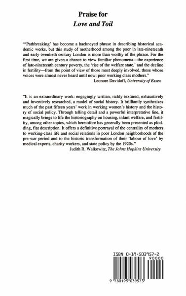 The history of the British working classes has until recently been written with a focus on the workplace or on such male organizations as clubs, unions, or national political parties. This study of mothers in London before the First World War stresses the distinctiveness of their experiences from those of other classes, and of the post World War I period, and demonstrates the ways in which mothers and their domestic choices were essential to the survival and cultural perpetuation of the working classes.