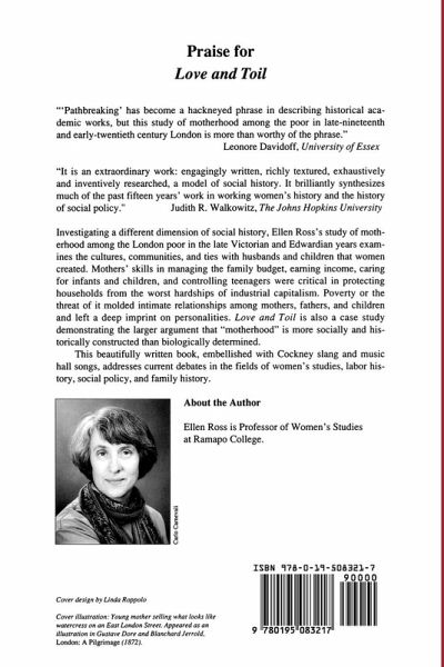 The feisty warm-hearted "mum" has long figured as a symbol of the working class in Britain, yet working-class history has emphasized male organizations such as clubs, unions, or political parties. Investigating a different dimension of social history, Love and Toil focuses on motherhood among the London poor in the late Victorian and Edwardian years, and on the cultures, communities, and ties with husbands and children that women created. Mothers' skills in managing the family budget, earning income, and caring for their children were critical in protecting households from the worst hardships of industrial capitalism, yet poverty or the threat of it molded intimate relationships and left its imprint on personalities. This book is also a case study demonstrating the larger argument that the concept of "motherhood" is more socially and historically constructed than biologically determined. Shaky household economics, pressure toward respectability, the close proximity of neighbors, the precariousness of infant and child life, and little chance of better lives for their children shaped the work and emotions of motherhood much more than did the biological experiences of pregnancy, birth, and lactation. This beautifully written book, embellished with Cockney slang and music hall songs, addresses fascinating questions in the fields of women's studies, labor history, social policy, and family history.