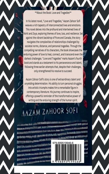 **About the Book: Love and Tragedies** In his latest novel, "Love and Tragedies," Aazam Zahoor Sofi weaves a rich tapestry of interconnected lives and emotions. This novel delves into the profound and intertwined lives of Rohit and Zoya, exploring themes of love, loss, and resilience. Set against the vibrant backdrop of Pune and Canada, the story navigates the complexities of relationships challenged by societal norms, distance, and personal tragedies. Through the compelling narratives of its characters, the book showcases the enduring power of love to heal, connect, and transcend even the darkest challenges. "Love and Tragedies" marks Aazam's fourth book and stands as a testament to his perseverance and talent, following three earlier attempts that, despite their challenges, only strengthened his resolve to succeed. Aazam Zahoor Sofi's story is one of extraordinary talent and unyielding determination. His ability to turn personal struggles into artistic triumphs makes him a remarkable figure in contemporary literature. His journey continues to inspire, offering a powerful reminder of the transformative power of writing and the enduring strength of the human spirit.