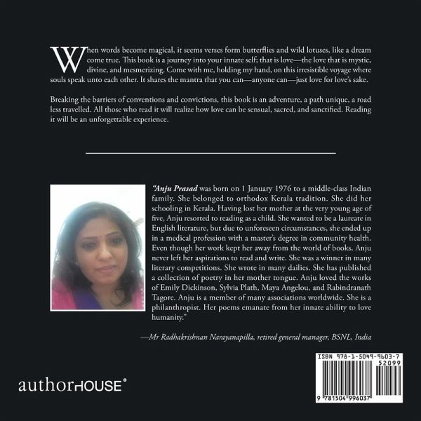 "Anju Prasad was born on 1 January 1976 to a middle-class Indian family. She belonged to orthodox Kerala tradition. She did her schooling in Kerala. Having lost her mother at the very young age of five, Anju resorted to reading as a child. She wanted to be a laureate in English literature, but due to unforeseen circumstances, she ended up in a medical profession with a master's degree in community health. Even though her work kept her away from the world of books, Anju never left her aspirations to read and write. She was a winner in many literary competitions. She wrote in many dailies. She has published a collection of poetry in her mother tongue. Anju loved the works of Emily Dickinson, Sylvia Plath, Maya Angelou, and Rabindranath Tagore. Anju is a member of many associations worldwide. She is a philanthropist. Her poems emanate from her innate ability to love humanity." -Mr Radhakrishnan Narayanapilla, retired general manager, BSNL, India