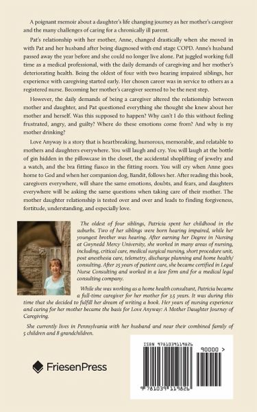 A poignant memoir about a daughter's life changing journey as her mother's caregiver and the many challenges of caring for a chronically ill parent. Pat's relationship with her mother, Anne, changed drastically when she moved in with Pat and her husband after being diagnosed with end stage COPD. Anne's husband passed away the year before and she could no longer live alone. Pat juggled working full time as a medical professional, with the daily demands of caregiving and her mother's deteriorating health. Being the oldest of four with two hearing impaired siblings, her experience with caregiving started early. Her chosen career was in service to others as a registered nurse. Becoming her mother's caregiver seemed to be the next step. However, the daily demands of being a caregiver altered the relationship between mother and daughter, and Pat questioned everything she thought she knew about her mother and herself. Was this supposed to happen? Why can't I do this without feeling frustrated, angry, and guilty? Where do these emotions come from? And why is my mother drinking? Love Anyway is a story that is heartbreaking, humorous, memorable, and relatable to mothers and daughters everywhere. You will laugh and cry. You will laugh at the bottle of gin hidden in the pillowcase in the closet, the accidental shoplifting of jewelry and a watch, and the bra fitting fiasco in the fitting room. You will cry when Anne goes home to God and when her companion dog, Bandit, follows her. After reading this book, caregivers everywhere, will share the same emotions, doubts, and fears, and daughters everywhere will be asking the same questions when taking care of their mother. The mother daughter relationship is tested over and over and leads to finding forgiveness, fortitude, understanding, and especially love.