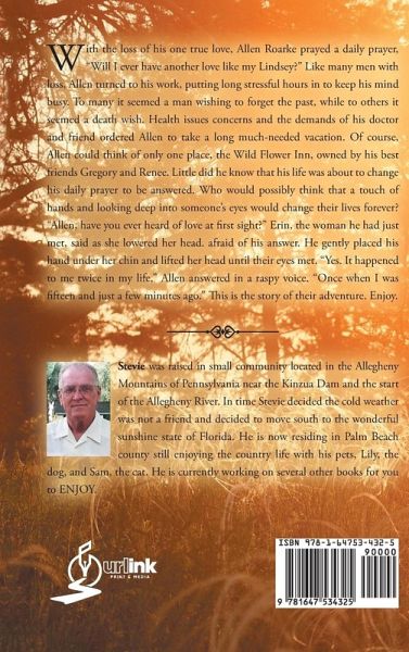 BOOK SUMMARY/SYNOPSIS: With the loss of his one true love, Allen Roarke prayed a daily prayer, "Will I ever have another love like my Lindsey?" Like many men with loss, Allen turned to his work, putting long stressful hours in to keep his mind busy. To many it seemed a man wishing to forget the past, while to others it seemed a death wish. Health issues concerns and the demands of his doctor and friend ordered Allen to take a long much-needed vacation. Of course, Allen could think of only one place, the Wild Flower Inn, owned by his best friends Gregory and Renee. Little did he know that his life was about to change his daily prayer to be answered. Who would possibly think that a touch of hands and looking deep into someone's eyes would change their lives forever? "Allen, have you ever heard of love at first sight?" Erin, the woman he had just met, said as she lowered her head. afraid of his answer. He gently placed his hand under her chin and lifted her head until their eyes met. "Yes. It happened to me twice in my life," Allen answered in a raspy voice. "Once when I was fifteen and just a few minutes ago." This is the story of their adventure. Enjoy. ABOUT THE AUTHOR: Stevie was raised in small community located in the Allegheny Mountains of Pennsylvania near the Kinzua Dam and the start of the Allegheny River. In time Stevie decided the cold weather was not a friend and decided to move south to the wonderful sunshine state of Florida. He is now residing in Palm Beach county still enjoying the country life with his pets, Lily, the dog, and Sam, the cat. He is currently working on several other books for you to ENJOY.