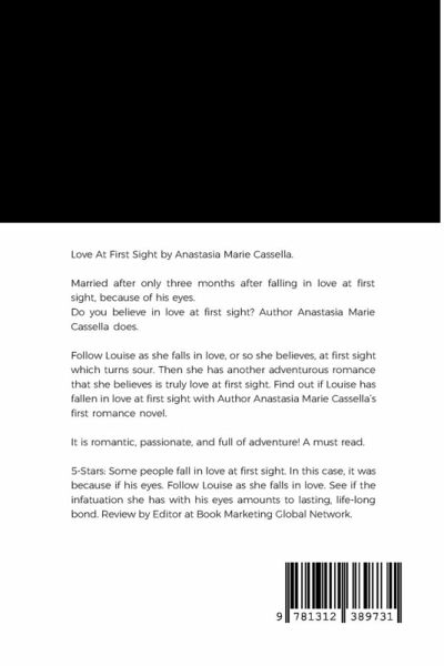 Love At First Sight by Anastasia Marie Cassella Married after only three months after falling in love at first sight, because of his eyes. Do you believe in love at first sight? Author Anastasia Marie Cassella does. Follow Louise as she falls in love, or so she believes, at first sight which turns sour. Then she has another adventurous romance that she believes is truly love at first sight. Find out if Louise has fallen in love at first sight with Author Anastasia Marie Cassella's first romance novel. It is romantic, passionate, and full of adventure! A must read. 5-Stars: Some people fall in love at first sight. In this case, it was because if his eyes. Follow Louise as she falls in love. See if the infatuation she has with his eyes amounts to lasting, life-long bond. Review by Editor at Book Marketing Global Network.
