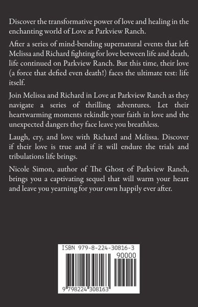 Discover the transformative power of love and healing in the enchanting world of Love at Parkview Ranch. After a series of mind-bending supernatural events that left Melissa and Richard fighting for love between life and death, life continued on Parkview Ranch. But this time, their love (a force that defied even death!) faces the ultimate test: life itself. Join Melissa and Richard in Love at Parkview Ranch as they navigate a series of thrilling adventures. Let their heartwarming moments rekindle your faith in love and the unexpected dangers they face leave you breathless. Laugh, cry, and love with Richard and Melissa. Discover if their love is true and if it will endure the trials and tribulations life brings. Nicole Simon, author of The Ghost of Parkview Ranch, brings you a captivating sequel that will warm your heart and leave you yearning for your own happily ever after.