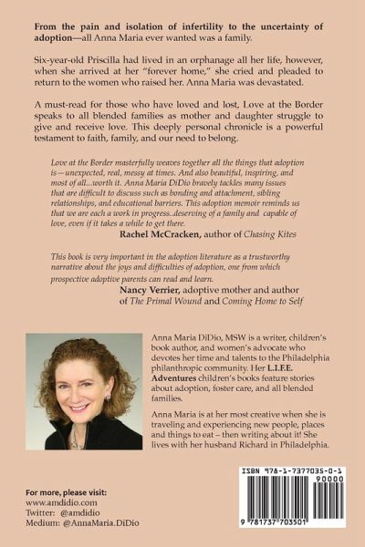 An inspiring adoption memoir for those who have loved, lost and laughed along the way to making a family. After her third miscarriage, Anna Maria knew that adoption was the only way to realize the family of her dreams. Precocious six-year-old Priscilla, brought to an orphanage in the hills of Mexico as a baby, said she wanted a home of her own. Could this be the family that they both have been looking for? Not so fast. To lose her biological mother and the women who raised her was a devastating blow. At the same time, her language, culture, food and friends vanished in a blink. Priscilla learns what it means to be a daughter and a sister. Anna Maria's skills as a mother are tested in a profound way. In this deeply personal and moving memoir spanning fifteen years, Anna Maria reveals her struggles in breaking down barriers to give and receive love. Love at the Border shares intimate family moments with candor and honesty - a powerful testament to faith, family, and our need to belong.