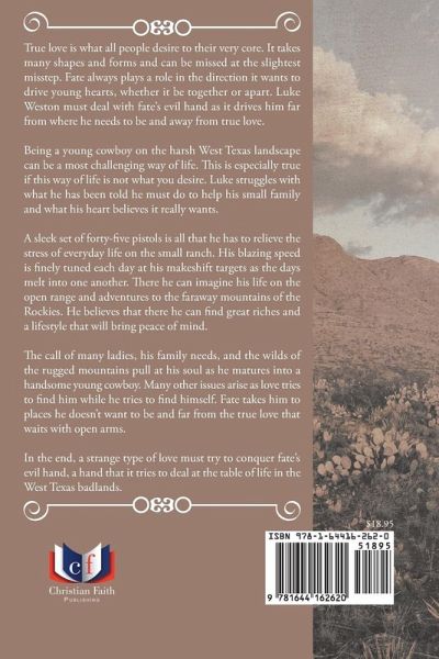 True love is what all people desire to their very core. It takes many shapes and forms and can be missed at the slightest misstep. Fate always plays a role in the direction it wants to drive young hearts, whether it be together or apart. Luke Weston must deal with fate's evil hand as it drives him far from where he needs to be and away from true love. Being a young cowboy on the harsh West Texas landscape can be a most challenging way of life. This is especially true if this way of life is not what you desire. Luke struggles with what he has been told he must do to help his small family and what his heart believes it really wants. A sleek set of forty-five pistols is all that he has to relieve the stress of everyday life on the small ranch. His blazing speed is finely tuned each day at his makeshift targets as the days melt into one another. There he can imagine his life on the open range and adventures to the faraway mountains of the Rockies. He believes that there he can find great riches and a lifestyle that will bring peace of mind. The call of many ladies, his family needs, and the wilds of the rugged mountains pull at his soul as he matures into a handsome young cowboy. Many other issues arise as love tries to find him while he tries to find himself. Fate takes him to places he doesn't want to be and far from the true love that waits with open arms. In the end, a strange type of love must try to conquer fate's evil hand, a hand that it tries to deal at the table of life in the West Texas badlands.
