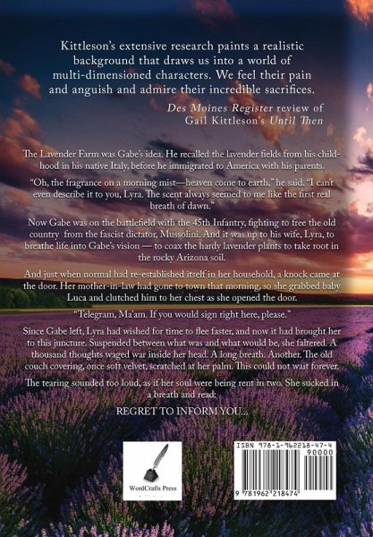 The Lavender Farm was Gabe's idea. He recalled the lavender fields from his childhood in his native Italy, before he had immigrated to America with his parents. "Oh, the fragrance on a morning mist-heaven come to earth," he had said. "I can't even describe it to you, Lyra. The scent always seemed to me like the first real breath of dawn." Now Gabe was on the battlefield with the 45th Infantry, fighting to free the old country from the fascist dictator, Mussolini, and it was up to his wife, Lyra, to breathe life into Gabe's vision - to coax the hardy lavender plants to take root in the rocky Arizona soil. And just when normal had re-established itself in her household, a knock came at the door. Her mother-in-law had gone to town that morning, so she grabbed baby Luca and clutched him to her chest as she opened the door. "Telegram, Ma'am. If you would sign right here, please." Since Gabe left, Lyra had wished for time to flee faster, and now it had brought her to this juncture. Suspended between what was and what would be, she faltered. A thousand thoughts waged war inside her head. A long breath. Another. The old couch covering, once soft velvet, scratched at her palm. This could not wait forever. The tearing sounded too loud, as if her soul were being rent in two. She sucked in a breath and read. REGRET TO INFORM YOU...