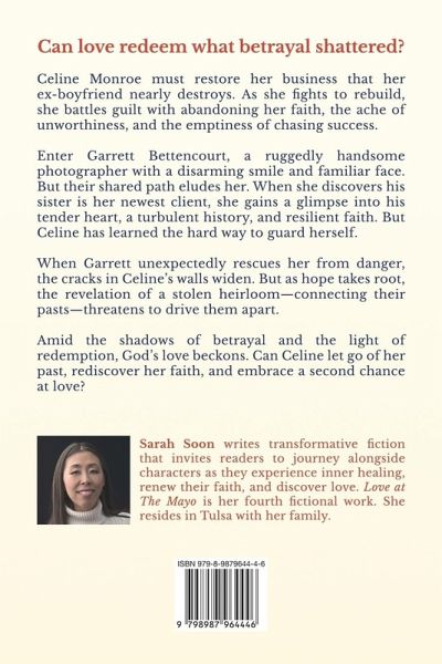 Can love redeem what betrayal shattered? Celine Monroe must restore her business that her ex-boyfriend nearly destroys. As she fights to rebuild, she battles guilt with abandoning her faith, the ache of unworthiness, and the emptiness of chasing success. Enter Garrett Bettencourt, a ruggedly handsome photographer with a disarming smile and familiar face. But their shared path eludes her. When she discovers his sister is her newest client, she gains a glimpse into his tender heart, a turbulent history, and resilient faith. But Celine has learned the hard way to guard herself. When Garrett unexpectedly rescues her from danger, the cracks in Celine's walls widen. But as hope takes root, the revelation of a stolen heirloom-connecting their pasts- threatens to drive them apart. Amid the shadows of betrayal and the light of redemption, God's love beckons. Can Celine let go of her past, rediscover her faith, and embrace a second chance at love?
