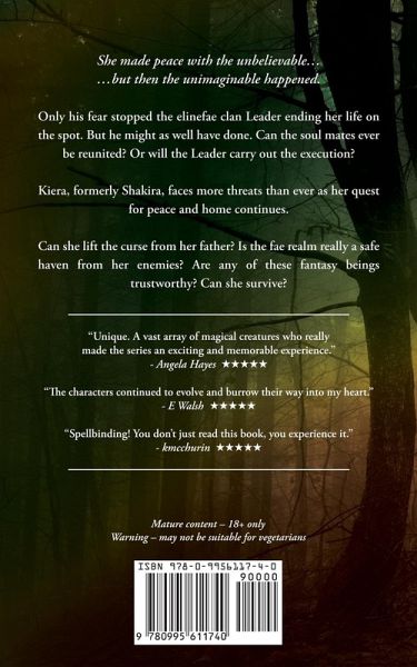 She made peace with the unbelievable… …but then the unimaginable happened. Only his fear stopped the elinefae clan Leader ending her life on the spot. But he might as well have done. Can the soul mates ever be reunited? Or will the Leader carry out the execution? Kiera, formerly Shakira, faces more threats than ever as her quest for peace and home continues. Can she lift the curse from her father? Is the fae realm really a safe haven from her enemies? Are any of these fantasy beings trustworthy? Can she survive?
