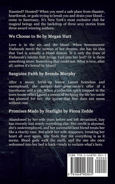 Haunted? Hunted? When you need a safe place from disaster, heartbreak, or gods trying to break you and drain your blood... come to Sanctuary. It's New York's most exclusive club for magical beings and the backdrop of three sexy stories from three award winning authors. We Choose to Be by Megan Hart Love is in the air...and the blood. When hemomancer Hadassah meets the woman of her dreams, she has no idea that Yael is actually a blood demon. Is it only the draw of Hadassah's talents that brings Yael into her bed? Or is there something more. Something that could last. What is love, after all, unless it's bound by blood? Sanguine Faith by Brenda Murphy After a messy break-up leaves Laurel homeless and unemployed, she accepts her great-uncle's offer of a townhouse and a job. When a seductive spirit trapped in the town house offers Laurel a means of escaping the life her uncle has planned for her, she learns that free does not mean without cost. Promises Made by Starlight by Fiona Zedde Abandoned by her wife years before and left devastated, Izzy has recently lost nearly everything else. Her credit is abysmal, she's underemployed, and her successful best friend treats her like a charity case. But when her wife reappears, breaking her heart all over again, Izzy finds that not everything is as it seems. Blood gods walk the earth, and the one she once welcomed into her bed is back-ready to reclaim what's hers.