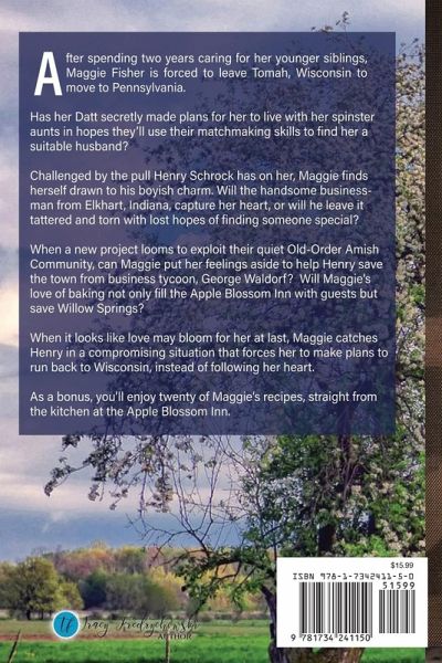 After spending two years caring for her younger siblings, Maggie Fisher is forced to leave her Amish community in Tomah, Wisconsin to move to Pennsylvania. Has her Datt secretly made plans for her to live with her spinster aunts in hopes they'll use their matchmaking skills to find her a suitable husband? Challenged by the pull Henry Schrock has on her, Maggie finds herself drawn to his boyish charm. Will the handsome businessman from Elkhart, Indiana, capture her heart, or will he leave it tattered and torn with lost hopes of finding someone special? When a new project looms to exploit their quiet Old-Order Amish Community, can Maggie put her feelings aside to help Henry save the town from business tycoon, George Waldorf? Will Maggie's love of baking not only fill the Apple Blossom Inn with guests but save Willow Springs? When it looks like love may bloom for her at last, Maggie catches Henry in a compromising situation that forces her to make plans to run back to Wisconsin, instead of following her heart. As a bonus, you'll enjoy twenty of Maggie's recipes, straight from the kitchen at the Apple Blossom Inn.