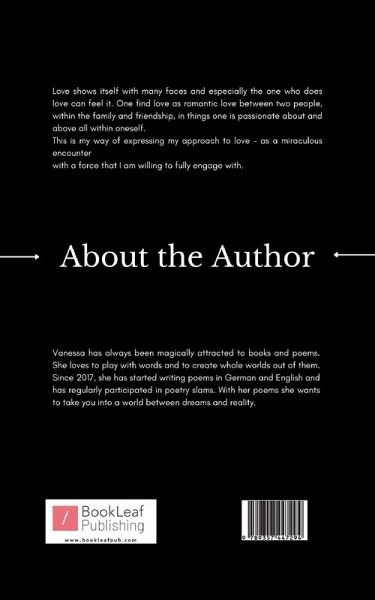 ""Love shows itself with many faces and especially the one who does love can feel it. One find love as romantic love between two people, within the family and friendship, in things one is passionate about and above all within oneself. This is my way of expressing my approach to love - as a miraculous encounter with a force that I am willing to fully engage with.""