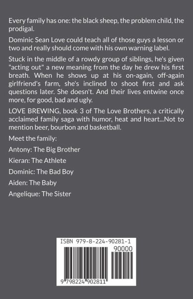 Every family has one: the black sheep, the problem child, the prodigal. Dominic Sean Love could teach all of those guys a lesson or two and really should come with his own warning label. Stuck in the middle of a rowdy group of siblings, he's given "acting out" a new meaning from the day he drew his first breath. When he shows up at his on-again, off-again girlfriend's farm, she's inclined to shoot first and ask questions later. She doesn't. And their lives entwine once more, for good, bad and ugly. LOVE BREWING, book 3 of The Love Brothers, a critically acclaimed family saga with humor, heat and heart...Not to mention beer, bourbon and basketball. Meet the family: Antony: The Big Brother Kieran: The Athlete Dominic: The Bad Boy Aiden: The Baby Angelique: The Sister