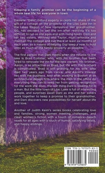 Keeping a family promise can be the beginning of a whole new life for everyone in town.... Danielle "Dani" Gilford eagerly accepts her share of the gift of a cottage on the property of the Lilac Lake Inn in the Lakes Region of New Hampshire. Her grandmother, Gigi, has decided to sell the inn after realizing it's too difficult to run as she ages and with rising taxes. Dani and her two sisters, Whitney and Taylor, must renovate and maintain the cottage and live there at least six months of each year, as a means of helping Gigi keep a vow to hold onto as much of the family property as possible. The first person that Dani meets when she returns to the lake is Brad Collister, who, with his brother, has been hired to renovate the inn for the new owners. His brother, Aaron, is as attractive as Brad, but life with the brothers is complicated. Brad is still grieving for his wife, who died two years ago from cancer and Aaron's interest lies with the business. And after working in Boston at an architectural design firm where the men in the office do everything they can to keep her from getting recognition for the work she does, the last thing Dani is looking for is a man. But the little town of Lilac Lake is full of interesting people, and surprises await Dani as she and her sisters work together to keep a promise to their grandmother, and Dani discovers new possibilities for herself about life and love. Another of Judith Keim's series books celebrating love and families, strong women meeting challenges, and clean women's fiction with a touch of romance-beach reads for all ages with a touch of humor, satisfying twists, and happy endings
