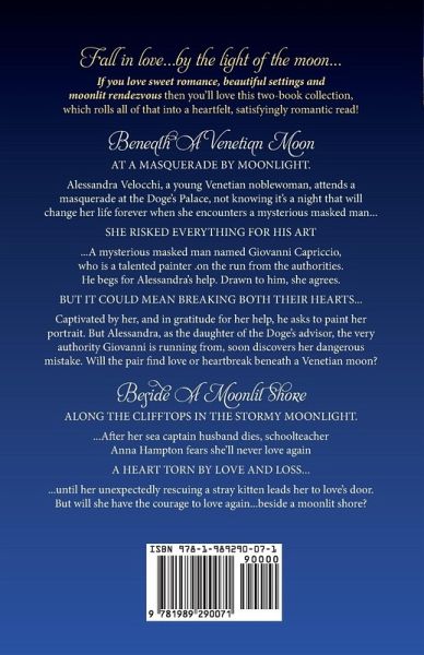 LARGE PRINT EDITION! Fall in love...by the light of the moon... If you love sweet romance, beautiful settings and moonlit rendezvous then you'll love this short, quick, read 2-novellas-in-1 omnibus, which rolls all of that into a heartfelt, satisfyingly romantic read. *This is not a boxed set in the traditional sense of the word, but it does contain the complete series (a duology of both short novellas: Beneath A Venetian Moon and Beside A Moonlit Shore. BENEATH A VENETIAN MOON: NOVELLA #1 At a masquerade by moonlight. Alessandra Velocchi, a young Venetian noblewoman, attends a masquerade at the Doge's Palace, not knowing it's a night that will change her life forever when she encounters a mysterious masked man... She risked everything for his art ...A mysterious masked man named Giovanni Capriccio, who is a talented painter on the run from the authorities, begs for Alessandra's help. Drawn to him, she agrees. But it could mean breaking both their hearts... Captivated by her, and in gratitude for her help, he asks to paint her portrait. But Alessandra, as the daughter of the Doge's advisor, the very authority Giovanni is running from, soon discovers her dangerous mistake. Will the pair find love or heartbreak beneath a Venetian moon? BESIDE A MOONLIT SHORE: NOVELLA #2 Along the clifftops in the stormy moonlight. ...After her sea captain husband dies, schoolteacher Anna Hampton fears she'll never love again A heart torn by love and loss... ...until her unexpectedly rescuing a stray kitten leads her to love's door. But will she have the courage to love again...beside a moonlit shore? Scroll up and buy today, and get ready to fall in love...by the light of the moon! DON'T MISS MORE SWEET ROMANCE BY THIS AUTHOR: The Sweethearts & Jazz Nights Series of Sweet Historical Romance: Dialing Dreams, #1 Shattered Melodies, #2 Fancy Footwork, #3 Unspoken Lyrics, #4 The Sweethearts & Jazz Nights Series: A Boxed Set (The Complete Collection) #5