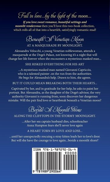 Fall in love...by the light of the moon... If you love sweet romance, beautiful settings and moonlit rendezvous then you'll love this short quick-read 2-novellas-in-1 compilation, which rolls all of that into a heartfelt, satisfyingly romantic read. *This is not a boxed set per se, but it does contain the complete series (a duology of both short novellas: Beneath A Venetian Moon and Beside A Moonlit Shore.) BENEATH A VENETIAN MOON: NOVELLA #1 At a masquerade by moonlight. Alessandra Velocchi, a young Venetian noblewoman, attends a masquerade at the Doge's Palace, not knowing it's a night that will change her life forever when she encounters a mysterious masked man... She risked everything for his art ...A mysterious masked man named Giovanni Capriccio, who is a talented painter on the run from the authorities, begs for Alessandra's help. Drawn to him, she agrees. But it could mean breaking both their hearts... Captivated by her, and in gratitude for her help, he asks to paint her portrait. But Alessandra, as the daughter of the Doge's advisor, the very authority Giovanni is running from, soon discovers her dangerous mistake. Will the pair find love or heartbreak beneath a Venetian moon? BESIDE A MOONLIT SHORE: NOVELLA #2 Along the clifftops in the stormy moonlight. ...After her sea captain husband dies, schoolteacher Anna Hampton fears she'll never love again A heart torn by love and loss... ...until her unexpectedly rescuing a stray kitten leads her to love's door. But will she have the courage to love again...beside a moonlit shore? Scroll up and buy today, and get ready to fall in love...by the light of the moon! DON'T MISS MORE SWEET ROMANCE BY THIS AUTHOR: The Sweethearts & Jazz Nights Series of Sweet Historical Romance: Dialing Dreams, #1 Shattered Melodies, #2 Fancy Footwork, #3 Unspoken Lyrics, #4 The Sweethearts & Jazz Nights Series: A Boxed Set (The Complete Collection) #5