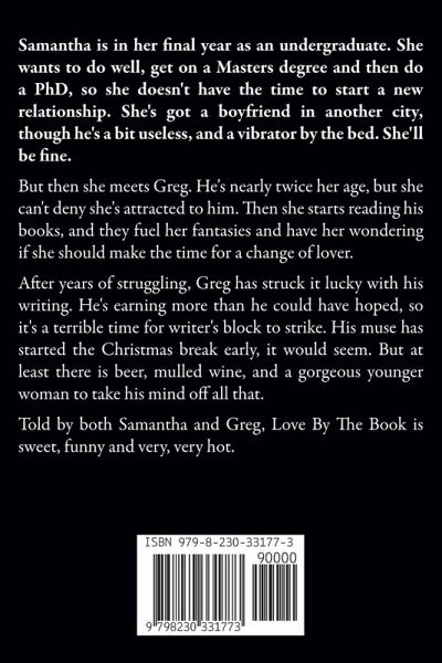Contains several explicit scenes. Over 18s only. Samantha is in her final year as an undergraduate. She wants to do well, get on a Masters degree and then do a PhD, so she doesn't have the time to start a new relationship. She's got a boyfriend in another city, though he's a bit useless, and a vibrator by the bed. She'll be fine. But then she meets Greg. He's nearly twice her age, but she can't deny she's attracted to him. Then she starts reading his books, and they fuel her fantasies and have her wondering if she should make the time for a change of lover. After years of struggling, Greg has struck it lucky with his writing. He's earning more than he could have hoped, so it's a terrible time for writer's block to strike. His muse has started the Christmas break early, it would seem. But at least there is beer, mulled wine, and a gorgeous younger woman to take his mind off all that. Told by both Samantha and Greg, Love By The Book is sweet, funny and very, very hot.